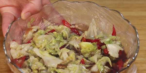 6、最後,我們為碗口裹上一層保鮮膜,將包菜放到冰箱裡冷藏醃制一夜,取出後即可食用。這樣,美味可口,制作簡單的酸辣醃包菜完成瞭!這樣做出來的包菜清脆可口,香辣開胃,超級下飯,而且制作成本和制作時間都很少,一次做出來吃上一個月都不會壞,喜歡吃包菜的朋友們趕緊在傢裡做著試一試吧!