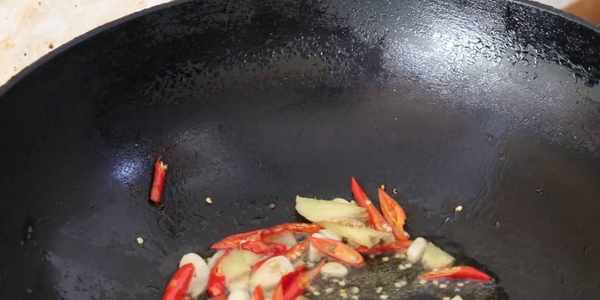 2、接下來,我們需要準備一些下鍋炒的底料。拿幾根小米椒切成小片,然後再取點薑和蒜,切出來點薑片和蒜片,放在一起備用。3、接著,我們開始炒料。起鍋燒油,油熱之後在鍋中放入薑片,蒜片,小米椒,開火翻炒,炒香。