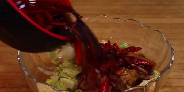 3、在倒入料汁後,要用保鮮膜密封冷藏一夜,讓料汁浸入包菜中。
