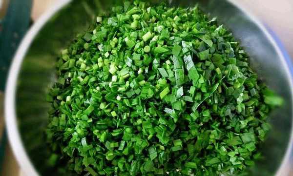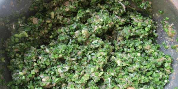 3、 新鮮的韭菜摘去老葉後清洗幹凈,然後切碎。五花肉剁成肉泥。