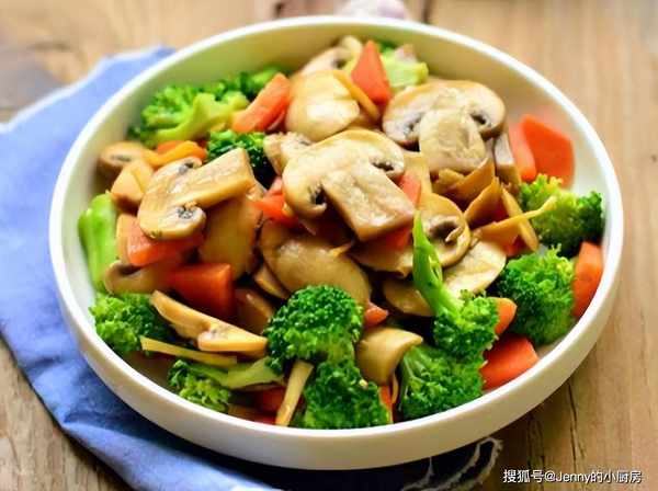 準備一些食材,分別有西藍花、口蘑、胡蘿卜。西藍花分成小朵,清洗兩遍,然後開水入鍋煮一分鐘。煮好後撈出瀝幹水分。