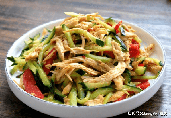 雞胸肉不燙手後,撕成小條或者細絲,和黃瓜、紅椒放在一起,再加入蒜末、薑絲、鹽、生抽、白糖、醋、香油抓拌均勻,這道菜就做好瞭。