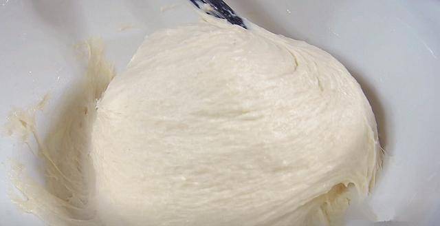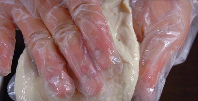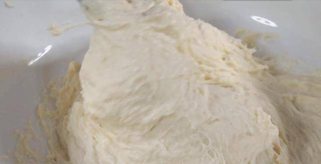 7.發酵好瞭的面團體積變大,拉開內部可以看到裡面充滿瞭氣孔。把它一下,攪拌到原來的大小。