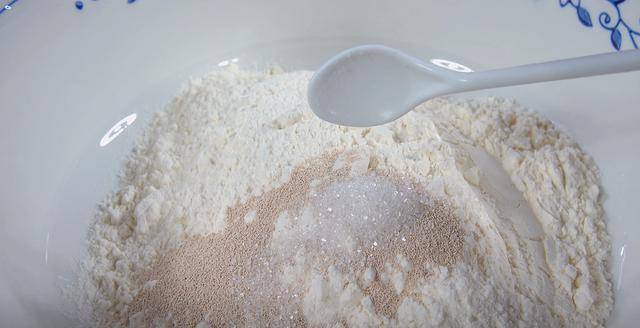 1.300克面粉放入盆中,加入3克酵母,5克白糖,攪拌均勻備用。