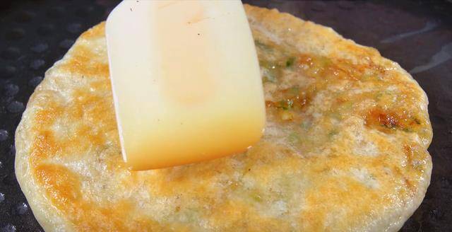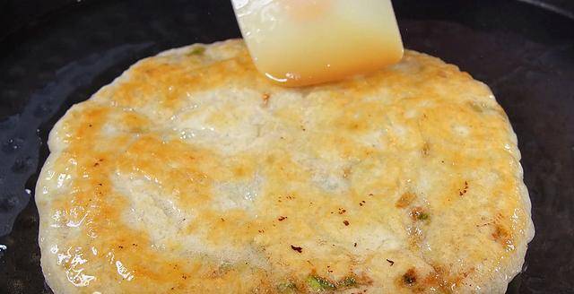 12.反復翻面多次,一直烙到兩面顏色金黃,餅面鼓起即可。