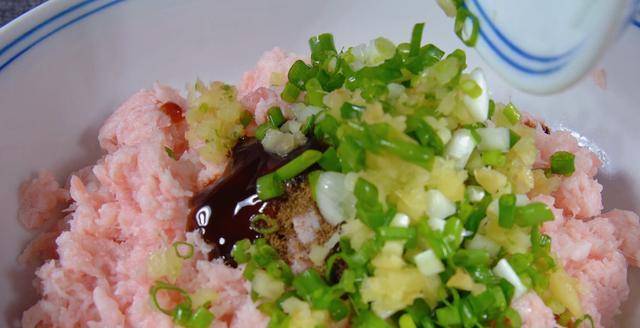 4.準備一點豬肉末,調入鹽少許雞精,花椒粉、生抽、蠔油、1個雞蛋,最後加入一把蔥花跟少許生薑末,把它們攪拌均勻。