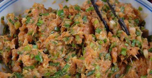 6.切點韭菜,跟肉末混合均勻,攪拌均勻,餡料就做好瞭。