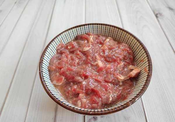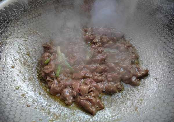 第四步:起鍋燒油,放入牛肉和蔥白炒出香味後,盛出。