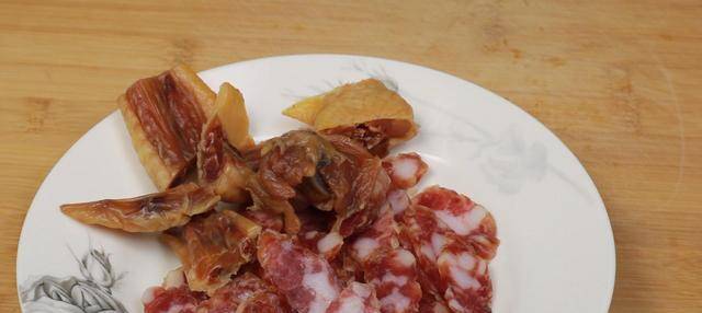 6、將臘香腸切成薄片、將臘雞翅剁成小塊,將少許的臘肉去掉肉皮後切成薄片;