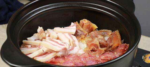 7、米飯燜煮5分鐘左右,揭開鍋蓋,整齊的將香腸、臘肉和臘雞翅擺放在砂鍋內,蓋上鍋蓋燜煮;