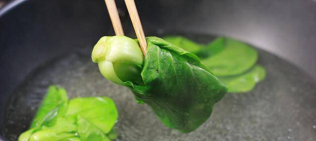 5、鍋中放入少量清水,放入1勺色拉油、1勺食鹽,大火煮沸後,放入小白菜入鍋汆燙,汆燙至8成熟後撈出;