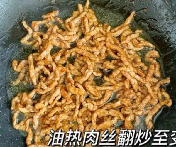 5:鍋中慢慢預熱,加上少許橄欖油,倒入瘦肉絲滑散,豬肉色澤變色,加上一些薑絲,迅速翻炒50秒左右。