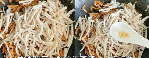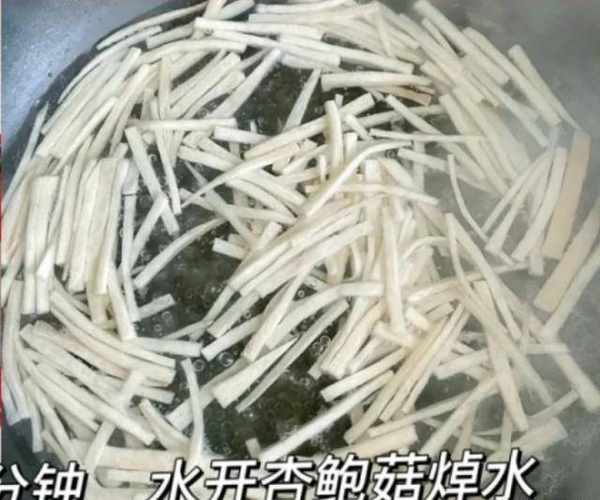 2:鍋中繼續煮一些冷水,燒開後加上半勺食鹽,煮沸後倒入杏鮑菇絲,焯水後撈出,記得要控幹水分。