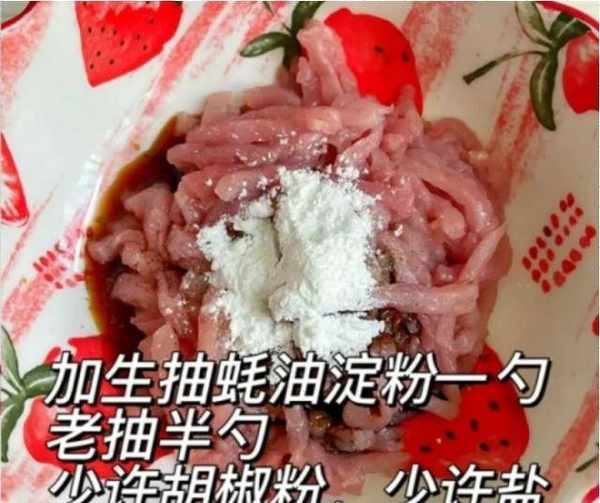 3:梅花肉提前洗幹凈,順著紋路切成片,切成一些瘦肉絲,生薑切成細絲,瘦肉絲放在碗中,加上一勺生抽和半勺蠔油,加上少許淀粉,加上半勺老抽,加上鹽和胡椒粉調味,挑選橄欖油半勺,幫助鎖住水分,醃制一會兒。