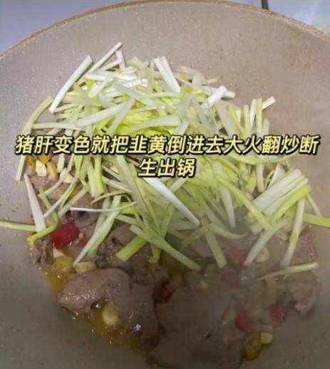 步驟6:調到大火快速爆炒,倒入醃制好的豬肝片,迅速爆炒至變色,火候一定要大一些,翻炒均勻,加上半勺料酒去腥。