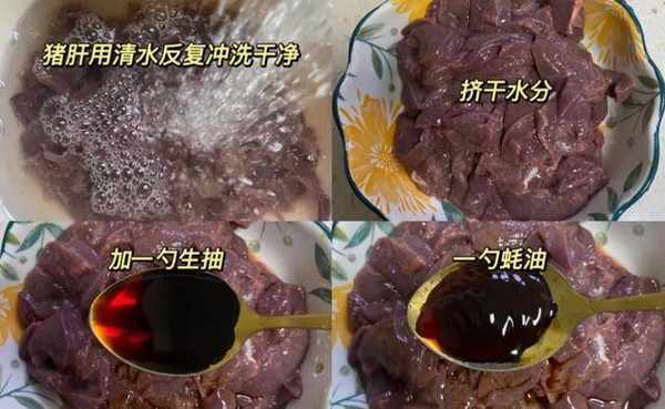 步驟2:先把嫩豬肝反復洗幹凈,豬肝要逆著紋路切片,豬肝用流水洗幹凈,沖洗掉表面的血水,記得要控幹掉水分。