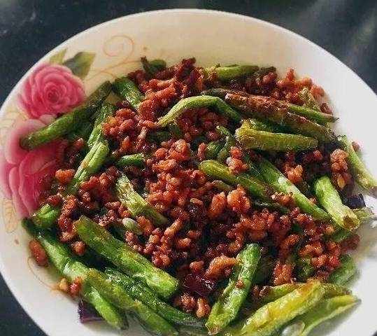 材料:四季豆400克、豬肉末150克、幹辣椒6顆、薑1小塊、蒜1頭、生抽、鹽、白砂糖少許、老抽;