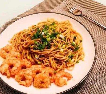 7、最後出鍋之前蝦頭撿出不要,面條盛入盤子中,撒上一些蔥花即可。