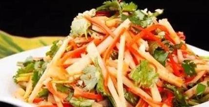 ?材料:香菜50克,冬筍150克,胡蘿卜絲、蒜末各少許、鹽、味精、生抽、芝麻油、辣椒油各適量