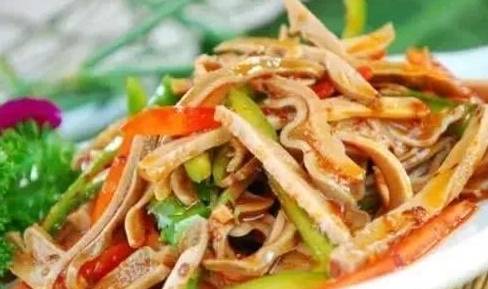 1.豬肚洗幹凈後,焯水洗凈,鍋裡加水待水開後下豬肚、胡椒粉,煮1個小時後,撈出豬肚放涼,將豬肚切成條備用。