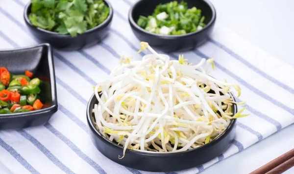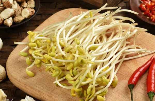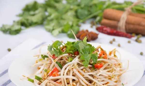 在我國,豆芽最先是以黑大豆作為原料,被《神農本草經》稱為“大豆黃卷”,並被列為“中品”,做法記載為:“造黃卷法,壬癸日(指的是冬末春初之時),以井華水浸黑大豆,候芽長五寸,幹之即為黃卷。用時熬過,服食所需也。”早時豆芽首先是用於食療,其次用於道傢養生。在宋朝時,食豆芽已相當普遍,豆芽與筍、菌,已並列為素食鮮味三霸。宋元時食豆芽,主要用於涼拌。