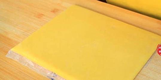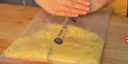 第四步,接著把混合好的面粉倒入保鮮袋子裡,先把面粉壓一壓,然後再用搟面杖搟平整,搟好後再用案板壓一壓,這樣更加均勻平整,接著我們用剪刀,把保鮮袋兩邊剪開,上面蓋一張油紙,然後快速的將面餅翻個面,撕掉上面的保鮮袋。