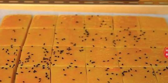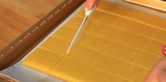 第五步,接著放入倒烤盤裡面,用鋒利的刀子將面餅分割成大小均勻的小塊,表面刷上雞蛋液,然後再撒上一些黑芝麻。