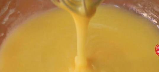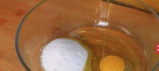 第一步,盆裡倒入150克玉米油,白糖80克,一個雞蛋,用蛋抽充分攪拌均勻,攪拌成這樣乳化的狀態就可以瞭。