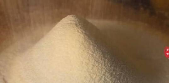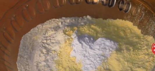 第二步,盆子裡倒入250克低筋面粉,在加入100克玉米面,泡打粉4克,小蘇打3克,然後充分攪拌均勻。