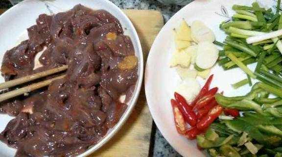 豬肝切好片後不要急著炒,放清水裡清洗一下,這樣能去掉豬肝的腥味,清洗幹凈後再瀝幹水,然後放入淀粉、豆瓣醬、少許鹽醃制一下,然後把青椒紅椒切條備用,薑蒜切片備用,下面就可以開始炒豬肝瞭。