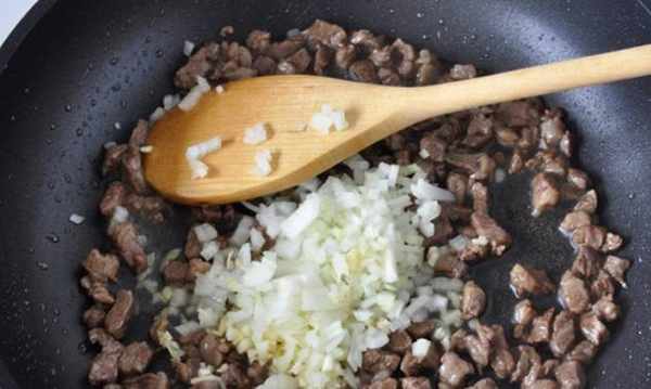 炒鍋裡面放入瞭適量的油,油溫熱之後,直接放入牛肉丁開始翻炒,一直炒到牛肉丁表面微黃,水分蒸發掉,倒入準備好的蔥薑蒜末、洋蔥末,然後翻炒均勻,炒出香味兒。