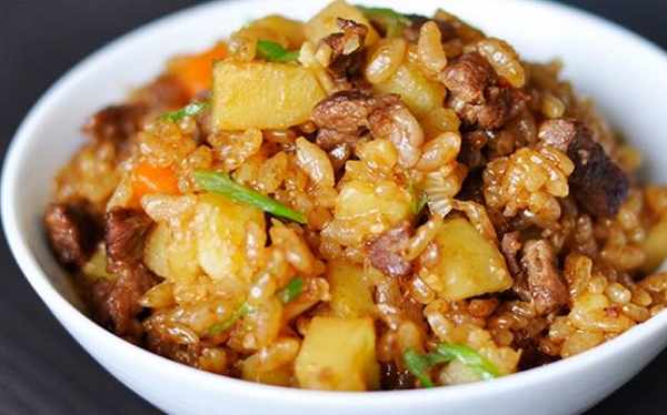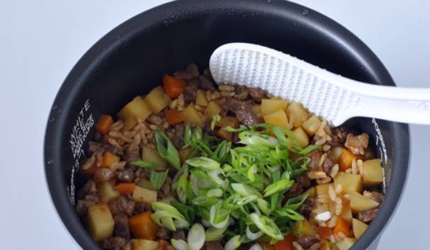 所有的食材全部都倒入我們泡好的大米蒸鍋裡,用鏟子將其鋪平,然後加入比平時煮飯稍微多一點的水,按煮飯鍵,之後就可以靜靜地玩手機瞭,等到程序自動結束,不要著急打開,讓它再燜幾分鐘,打開鍋蓋,放入蔥花,攪拌均勻就可以開吃瞭,味道特別棒。