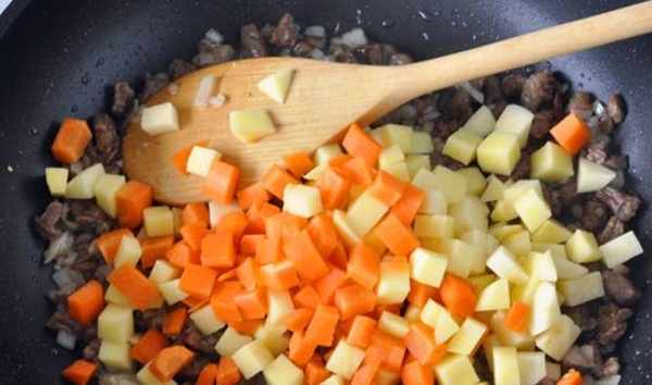 接著倒入我們切好的胡蘿卜丁和土豆丁,然後開大火將其翻炒均勻,這個時候也可以放入一些調味品。