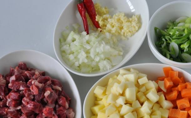 這就是裡面所用到的一些食材瞭,一塊牛肉清洗幹凈切成丁,半個胡蘿卜,一個土豆洗凈切成丁,洋蔥直接切成沫,生薑和大蒜也切成末。