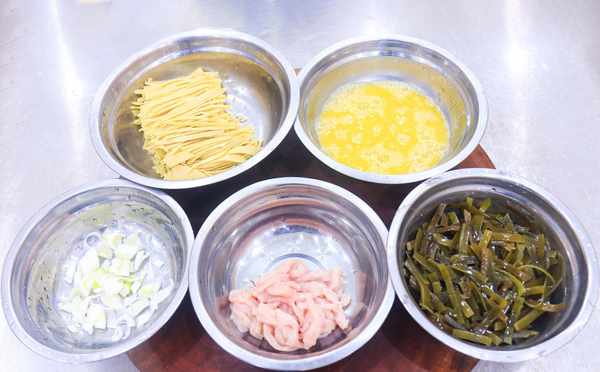 1、準備一小塊裡脊肉,先平刀片成薄片,再切成肉絲,豆腐皮兩張,劃開以後疊放在一起 切成豆腐絲,海帶一把切成段,放入清水中洗幹凈,大蔥破開,切成蔥花備用。另準備一個小碗,打入兩個雞蛋,加鹽打散,食鹽能使蛋黃和蛋清更好的融合在一起。