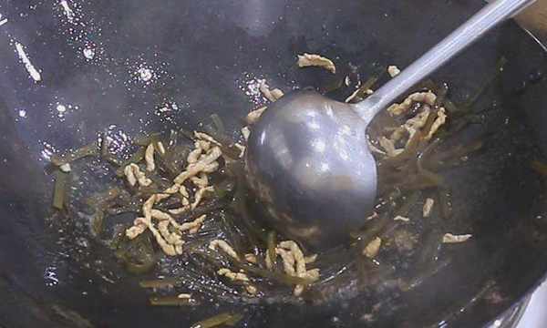 3、鍋內燒油,充分滑鍋以後倒出熱油,留少許底油,放入肉絲煸炒一會,肉絲炒白炒香以後倒入海帶絲,加入醬油10克,開中火繼續煸炒。