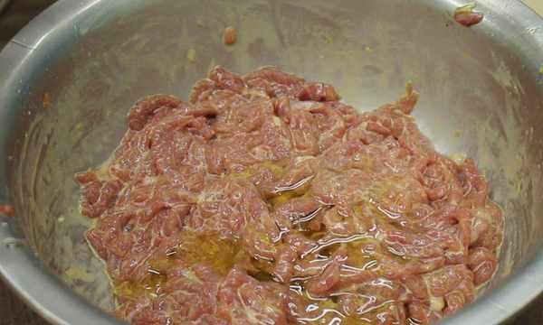 2、牛肉加鹽、雞粉、胡椒粉、蠔油、生抽,事先準備好的蔥薑料酒水也倒進去一些,順著一個方向快速攪打,讓牛肉絲吸收料汁以及蔥薑水,增加滑嫩感。然後磕進去一個雞蛋清繼續攪拌,再捏進去一小撮淀粉鎖住水分。最後用油封一下,放一邊醃制十分鐘。