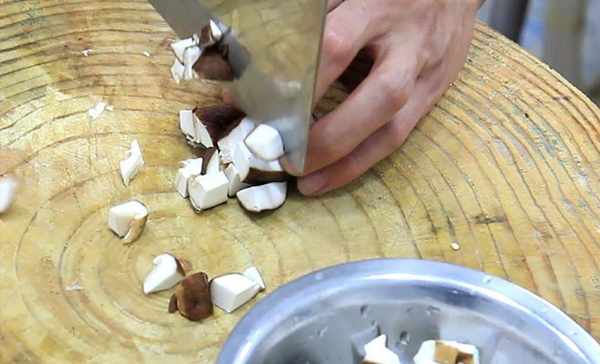 2、準備裡脊肉30克,先片成薄片,再切成肉粒。小米椒五個,切成辣椒圈。青線椒三個,同樣切成圈,青紅椒用來配色比較好看。香菇兩個,切成香菇粒。