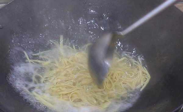 3、上過漿的牛肉絲想要保持滑嫩感,滑油是最關鍵的一步。鍋裡燒寬油,油溫升至四成熱時,把肉絲倒進去快速攪散,讓它均勻受熱。前後20秒的時間,肉絲定型變白起鍋。