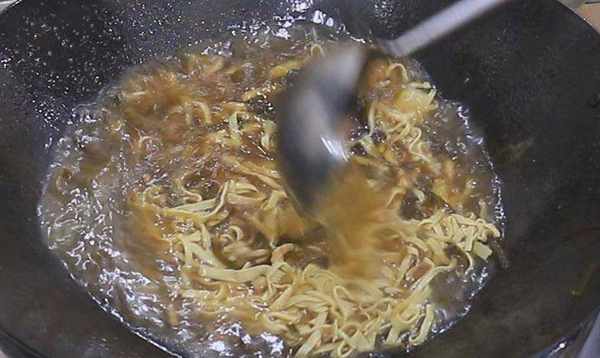 4、把海帶炒熟、炒香,然後沿鍋邊倒入適量的清水,放入控過水分的豆腐皮,加入食鹽3克、胡椒粉2克、雞精2克、攪拌化開調料。