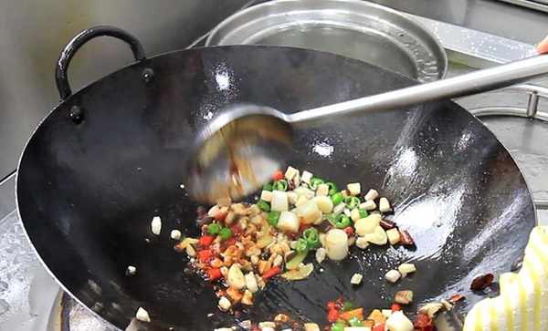 4、鍋內留底油,放入蔥、薑、蒜、幹辣椒一起翻炒,翻炒出香味以後,倒入肉粒、香菇粒、和青紅椒圈繼續翻炒,放入豆瓣醬5克,炒出豆瓣醬的紅油,再加入蠔油和生抽2克提一下鮮味,翻炒化開以後,淋入料酒3克去腥,加入適量的清水。