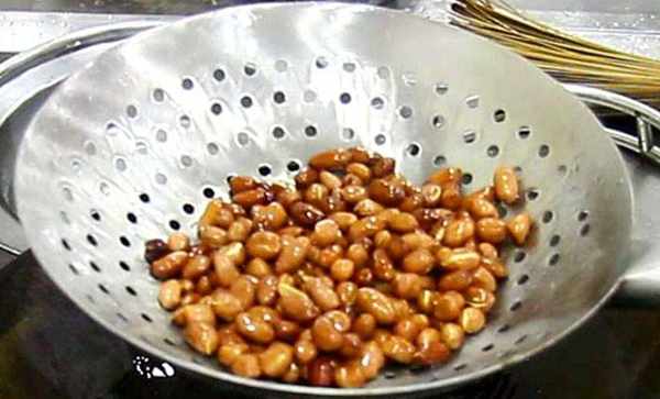 3、鍋裡燒油,涼油倒入花生米,開小火慢慢炸,外皮稍微變紅,並聽到噼啪的炸裂聲,大概響7到8下花生米就熟瞭,撈出來控油冷卻。