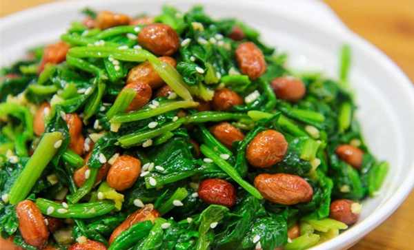 1、菠菜一把,洗凈後控幹水分;花生米適量放入盆中;大蒜拍扁切成碎末備用。