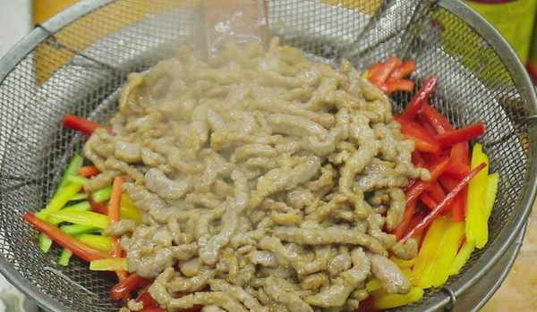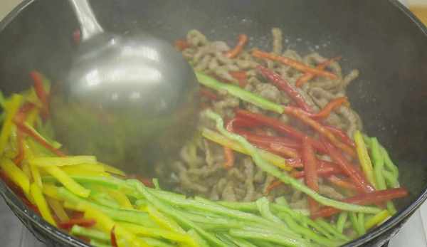 4、準備黃椒、紅椒以及青椒,全都切成細絲,搭配顏色,營養更豐富。趁著熱油把辣椒絲也激一下,這樣顏色和口感都會更好。