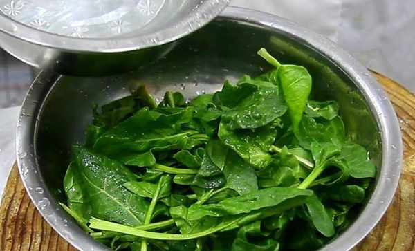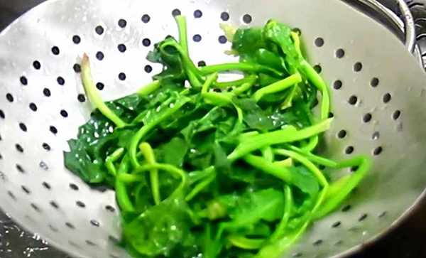 2、鍋裡燒水,加入一勺食鹽,一勺植物油,水開後倒入菠菜,焯水40秒去除草酸,然後撈出、用水沖洗沖涼。