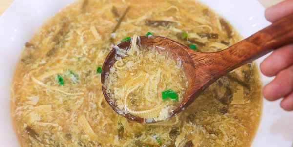 5、湯汁燒開後邊攪拌邊倒入水淀粉,這樣不容易坨塊糊底。把湯汁調自己喜歡的濃稠度,然後把蛋液淋入鍋中飄成蛋花,蛋花飄起來後關火,淋入芝麻香油,最後撒上蔥花即成。