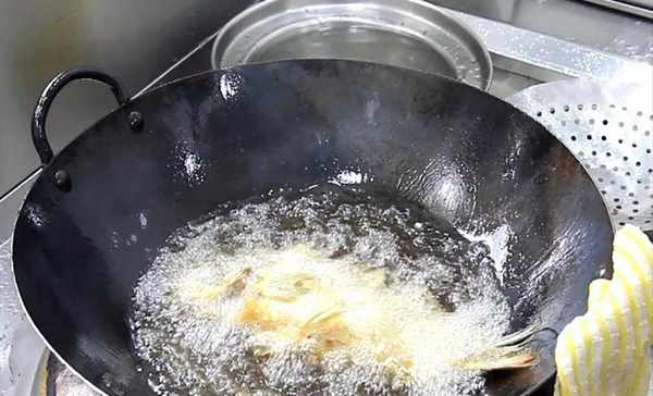 3、鍋內燒油,油溫升至5成熱時,掂起魚尾把鯽魚放入油鍋,開中小火炸制三分鐘左右,把魚炸至金黃酥脆即可出鍋控油。炸鯽魚的時候要保持小火慢炸,不要翻動魚以免影響定型。