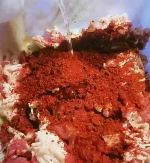 3.再把打成粉的香料倒入肉中,再倒入北京二鍋頭120克攪拌均勻。