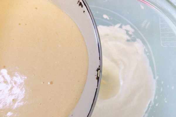 第六步:將翻拌均勻的混合物倒入蛋白霜中,再次翻拌均勻。