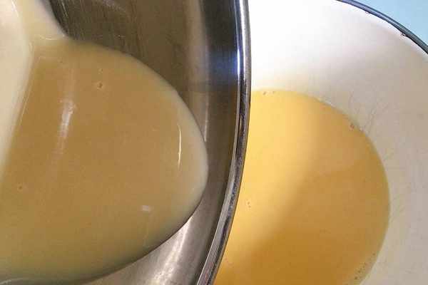 第三步:攪勻的面糊倒入剛剛拌勻的蛋黃牛奶中,翻拌均勻備用。